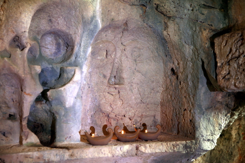 Na zapadnoj strani litice pećine veliki je reljef sa središnjim likom zmaja s rastvorenim raljama prema „ženi obasjanoj suncem“ u polumjesecu – simbol vječne tajne sukoba dobra i zla.