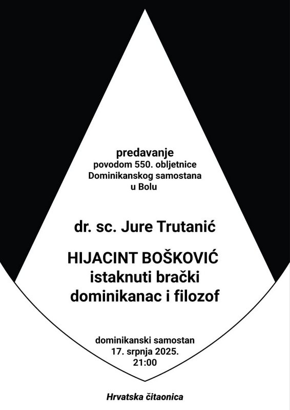 Dr. sc. Jure Trutanić, povjesničar iz Selaca, osvijetlio nam je život i djelo znamenitog dominikanca Hijacinta Boškovića, uglednog teologa, filozofa i pisca, koji se rodio u Selcima na Braču 1900., a umro 1947. u Starome Gradu na Hvaru. Osnovnu je školu pohađao u Selcima, a gimnaziju u dominikanskim sjemeništima u Bolu i Starom Gradu.