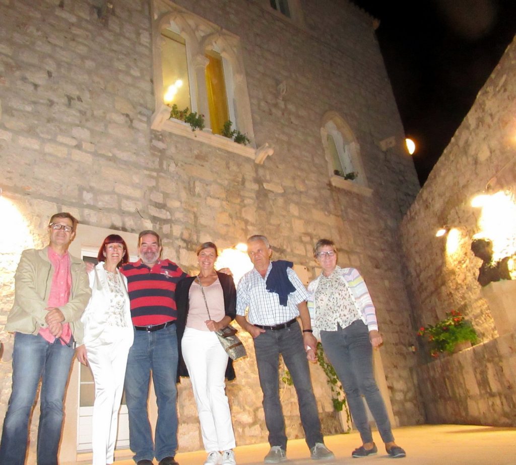 Palača Hranotić jedinstvena je s obzirom na to da je građena tesanim blokovima rumeno-bijelog konglomerata, lokalne bolske breče međutim, sjeverno pročelje građeno je priklesanim i lomljenim kamenom.“